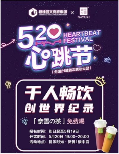 隨著“后浪”崛起,“Z世代”青年逐漸成為商業(yè)消費市場的主力軍。隨之而來的,是“顏值即正義”、“粉絲效應(yīng)”、“網(wǎng)紅經(jīng)濟(jì)”等新興消費趨勢。緊抓這一趨勢,碧桂園文商旅于此次心跳節(jié)探索“網(wǎng)紅營銷”,跨界網(wǎng)紅茶飲品牌 —— 奈雪的茶,推出“千人同飲奈雪”活動,并將嘗試申請史上最多人同飲奶茶的世界紀(jì)錄,展示了碧桂園文商旅在跨界營銷和聚焦年輕流量方面的突破式創(chuàng)新。