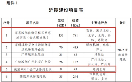 另一條城際鐵路——深惠城際,根據(jù)去年國家發(fā)改委批復(fù)文件,已被列為近期建設(shè)項(xiàng)目,2022年前啟動(dòng)建設(shè)。