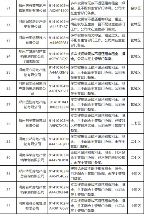 上述33家房企存在“無故克扣租客租金、押金;租賃合同使用不規(guī)范、簽訂的租賃合同不備案;從業(yè)主體未在主管部門備案;拖欠租金、押金后無法取得聯系”等行為。