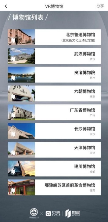 VR看展是貝殼找房在今年上線的新功能,其初心在于發(fā)揮科技的社會(huì)價(jià)值。依托博物館的線上三維重建,用戶可通過(guò)貝殼找房APP,北京、武漢、杭州、南京、廣州、長(zhǎng)沙、天津、成都、信陽(yáng)九大城市博物館的官網(wǎng)等入口進(jìn)入線上展廳,直觀、生動(dòng)地瀏覽每間展館,獲得便捷高效的“云”覽文化體驗(yàn)。