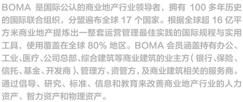 商業(yè)地產(chǎn)可持續(xù)發(fā)展不只是節(jié)能,還包括建筑健康、環(huán)保,是從建造到運(yùn)營(yíng)的長(zhǎng)期的工作,需要培訓(xùn)人才專業(yè)能力,發(fā)揮建筑硬件運(yùn)營(yíng)效率與品質(zhì)。業(yè)主方、租戶的推動(dòng)與支持能夠?yàn)楣芾矸、服?wù)商改革帶來(lái)更多動(dòng)力。BOMA作為商業(yè)地產(chǎn)協(xié)會(huì)能夠?yàn)樾袠I(yè)可持續(xù)發(fā)展提供專業(yè)資源與管理框架支持,滿足資產(chǎn)增值與社會(huì)可持續(xù)發(fā)展的雙重需求。