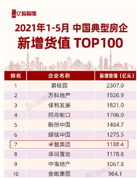 近日,卓越集團(tuán)發(fā)布了5月銷售成績單,其單月簽約額突破150億元大關(guān),簽約回款率超85%。另外,5月31日億翰智庫發(fā)布2021年1-5月房企業(yè)績榜單,數(shù)據(jù)顯示,卓越集團(tuán)1-5月實(shí)現(xiàn)全口徑銷售收入516.1億元,同比增速達(dá)80%,位列典型房企1-5月增速榜單第14位,業(yè)績增長十分顯著。