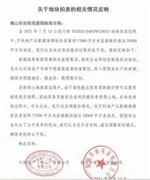 7月14日,落款為中海地產(chǎn)(佛山)有限公司、保利華南實(shí)業(yè)有限公司的《關(guān)于地塊拍賣的相關(guān)情況反映》被送至佛山市自然資源局南海分局!肚闆r反映》稱,土地拍賣過程中,由于誰先報(bào)出雙封頂?shù)膱?bào)價(jià)便可以提前結(jié)束競買流程,因此容易導(dǎo)致有企業(yè)利用跳價(jià)來競得土地。
