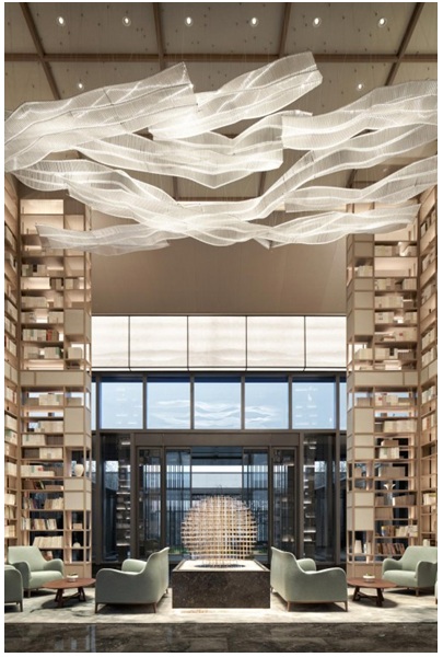 “高山仰止,景行行止。雖不能至,然心向往之!北卷(xiàng)目思考關(guān)于精神的云端和生活的浪潮兩者間的分野與權(quán)衡,構(gòu)設(shè)一處涵雅靜心之所——永豐樂境。云端之上,是書香院處,云端之下,是生活與藝術(shù)糅合的集展示、洽談、辦公、活動等為一體的多功能場景,傳遞品牌對理想中的明日生活圖景的煥新態(tài)度。