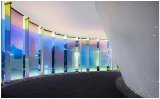 轉(zhuǎn)角廣場是觀眾席,越過水面,視線所及,在幻彩玻璃的映襯下,中央演藝廳下的鋼琴正在演奏,舒緩飄揚的樂曲隨風而至,身著蝴蝶裙的“舞者”合著節(jié)拍,裙擺輕盈,沉浸音樂,旋轉(zhuǎn)不停。
