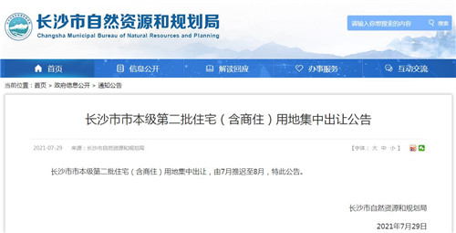 房訊網(wǎng)訊 7月29日,長沙市自然資源和規(guī)劃局發(fā)布公告,長沙市市本級第二批住宅(含商。┯玫丶谐鲎專7月推遲至8月。