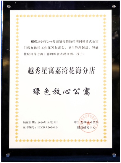 出色的疫情防控源于常態(tài)化的管理標(biāo)準(zhǔn)和專業(yè)的防控體系,在“2020領(lǐng)航|租賃式公寓行業(yè)國(guó)際先鋒論壇”上,越秀星寓荔灣花海店就曾憑借優(yōu)秀的防疫措施和衛(wèi)生管理創(chuàng)新,獲得“綠色放心公寓”及“年度抗疫貢獻(xiàn)優(yōu)秀店長(zhǎng)”等榮譽(yù)。