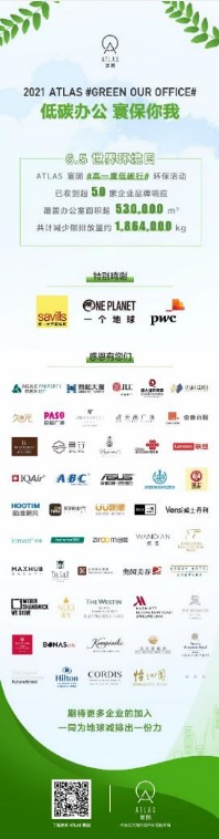 與此同時(shí),ATLAS 寰圖同步于線上發(fā)起了#高一度低碳行#辦公室升溫環(huán);顒(dòng),呼吁企業(yè)將辦公室空調(diào)溫度調(diào)高1攝氏度,為地球節(jié)能減排做出一份切實(shí)努力。截止活動(dòng)結(jié)束,該話題行動(dòng)已收到來(lái)自超50家企業(yè)的“低碳辦”伙伴的積極響應(yīng),覆蓋面積超53萬(wàn)平方米,累計(jì)幫助減碳達(dá)1,864噸。