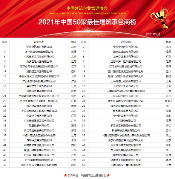 近日,2021年《中國建筑企業(yè)綜合實力100強》暨《中國50家最佳建筑承包商》排行榜發(fā)布,這是中國建筑企業(yè)管理協(xié)會對中國建筑業(yè)進行全面、科學(xué)、獨立的企業(yè)實力發(fā)展調(diào)查研究宣傳發(fā)布工作。通過對超過3000家利潤總額在1億元至950億元之間的中國大陸建筑施工、勘察設(shè)計、工程監(jiān)理等中國建筑企業(yè)進行了數(shù)據(jù)采集研究,基于對財務(wù)分析、行業(yè)分析、市場占有率分析確定候選企業(yè),邀請100位企業(yè)高管、學(xué)者及官員對經(jīng)資格審核符合要求的企業(yè)進行評選,比照國際上通行的做法,根據(jù)營業(yè)收入、資產(chǎn)總額、利潤總額、資信等級、社會貢獻、業(yè)主滿意度等指標(biāo)對候選企業(yè)進行綜合評分排序,并對部分候選企業(yè)進行實地拜訪,從中遴選出100家中國建筑企業(yè)綜合實力100強企業(yè)及50家中國50家最佳建筑承包商企業(yè)。在此基礎(chǔ)上通過與世界500強企業(yè)進行綜合對比分析,進而有針對性地提出促進企業(yè)做強做大做久的策略建議,在全國范圍內(nèi)形成了巨大的社會影響力。