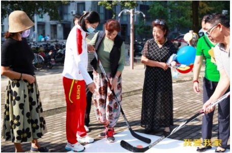 體驗(yàn)階段,主持人向社區(qū)居民科普冬奧知識(shí),講解現(xiàn)場(chǎng)的冬奧體驗(yàn)項(xiàng)目。在短道速滑世界冠軍林悅的帶領(lǐng)下,現(xiàn)場(chǎng)百余名居民共同體驗(yàn)旱地冰壺、冰球射門(mén)、冬奧知識(shí)飛行棋等趣味冰雪活動(dòng)。