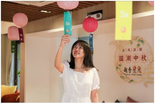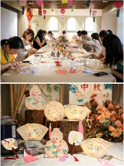 在滿滿的古風(fēng)氛圍下,越秀星寓精心準(zhǔn)備了一系列中秋限定活動(dòng),做燈籠畫(huà)團(tuán)扇猜燈謎…讓星友們體驗(yàn)古人的樂(lè)趣。在管家DJ小哥時(shí)而古典時(shí)而時(shí)尚的音樂(lè)氛圍下,星友們一邊聽(tīng)著聊著最近正火的《披荊斬棘的哥哥》,一邊在越秀星寓小管家手把手教導(dǎo)下,親手做一盞超精致的繡花燈籠,搭骨架貼繡花巾放電子燭芯,耗時(shí)1個(gè)多小時(shí)完成一盞葫蘆或者扇子別致造型的燈籠,放在房間里明亮了整個(gè)中秋假期!