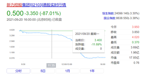 9月20日新力控股集團股價暴跌 來源:東方財富