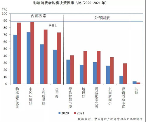 根據(jù)房企品牌調(diào)研結(jié)果顯示,2021年影響消費者購房決策因素中,最重要的因素是小區(qū)環(huán)境,其次是物業(yè)服務(wù)、工程質(zhì)量和房型。與2020年調(diào)研數(shù)據(jù)相比,各項因素重要性均有所上升。分類來看,占比較高的四項,即小區(qū)環(huán)境、工程質(zhì)量、房型、綠色智慧節(jié)能均圍繞產(chǎn)品本身。周邊配套、地段、負面新聞、營銷活動等因素占比則低于產(chǎn)品本身因素的影響。由此可見,對于消費者來說,影響決策最重要的因素就是產(chǎn)品本身,這也符合近年來房企“回歸產(chǎn)品”的趨勢。