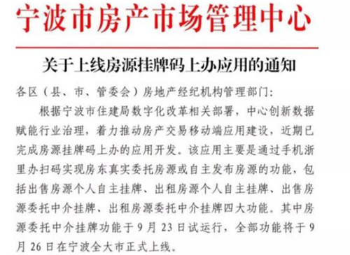 9月23日,寧波市房產(chǎn)市場管理中心發(fā)布《關于上線房源掛牌碼上辦應用的通知》,房源掛牌碼上辦主要是通過手機浙里辦掃碼實現(xiàn)房東真實委托房源或自主發(fā)布房源的功能,包括出售房源個人自主掛牌、出租房源個人自主掛牌、出售房源委托中介掛牌、出租房源委托中介掛牌四大功能。其中房源委托中介掛牌功能于9月23日試運行,全部功能將于9月26日在寧波全市正式上線。