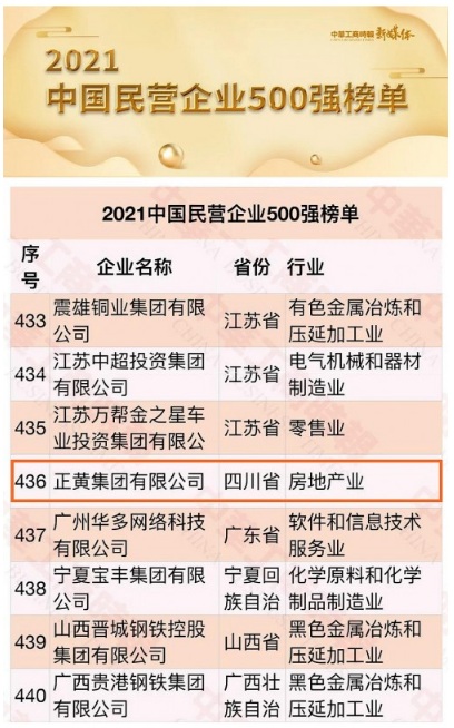 9月25日,由全國工商聯(lián)、湖南省人民政府主辦的2021中國民營企業(yè)500強(qiáng)峰會在湖南長沙隆重召開。此次峰會上,全國工商聯(lián)發(fā)布了《2021中國民營企業(yè)500強(qiáng)榜單及相關(guān)調(diào)研分析報告》,正黃集團(tuán)憑借極具競爭力的發(fā)展前景、穩(wěn)健的經(jīng)營模式、持續(xù)提升的盈利能力再度入榜,位列436位,而在本年度的中國民營企業(yè)500強(qiáng)中,四川省共有8家民營企業(yè)入榜。