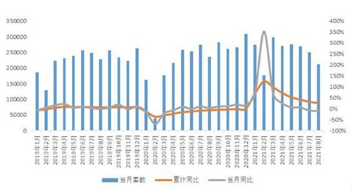數(shù)據(jù)顯示,1-8月新房市場成交套數(shù)累計同比增長25%,成交面積累計同比增長24%,套數(shù)和面積累計同比自2月以來持續(xù)收窄。同比2020年,8月單月套數(shù)和面積同比下降10%和14%,下降幅度逐漸加大。