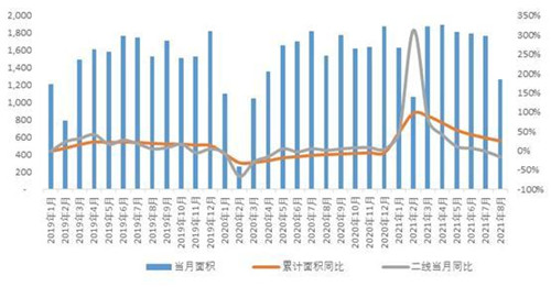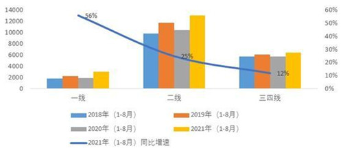 據(jù)悉,8月一線城市市場活躍度仍為最高,但降速放緩。同比2020年,一線、二線、三四線城市新房成交面積累計同比分別增長56%、25%、12%,環(huán)比上個月分別回落8%、7%、6%,其中一線、三四線城市新房成交面積累計同比降速放緩,二線城市保持穩(wěn)定。
