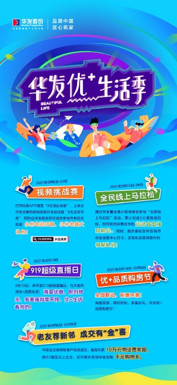 金秋九月,華發(fā)股份盛情開啟“優(yōu)+生活季”,聯(lián)動(dòng)全國五大區(qū)域,開展系列感恩回饋活動(dòng)。此次“優(yōu)+生活季”將于9月6日正式拉開帷幕,一直持續(xù)至10月8日,不僅有抖音視頻挑戰(zhàn)賽、全民線上馬拉松、919華發(fā)超級直播日、華發(fā)優(yōu)+品質(zhì)購房節(jié)四大主題活動(dòng)輪番上演,還有業(yè)主專享“金”喜福利,為幸福加碼。以“生活”之名,迎接中秋、國慶雙節(jié)狂歡;以“收獲”之義,在這個(gè)秋天,與華發(fā)一同感受生活的美好。