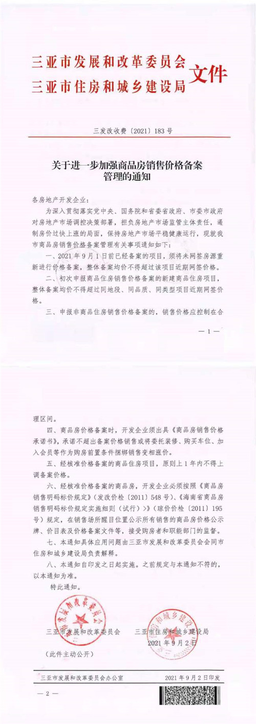 記者向海南省三亞市發(fā)展和改革委員會(huì)確認(rèn),三亞市發(fā)改委與三亞市住房和城鄉(xiāng)建設(shè)局9月2日聯(lián)合印發(fā)了《關(guān)于進(jìn)一步加強(qiáng)商品房銷售價(jià)格備案管理的通知》。