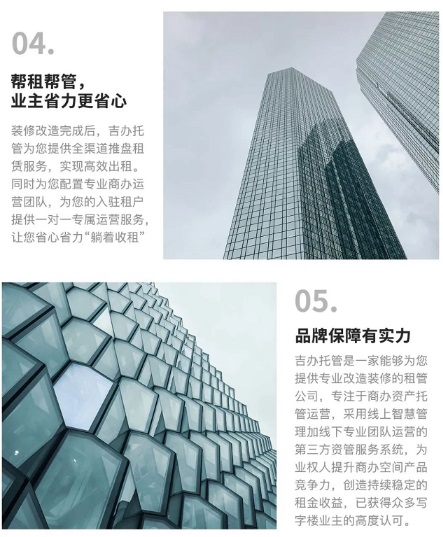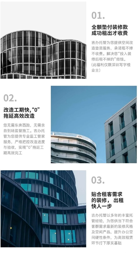 吉辦托管深耕商辦行業(yè)多年,擁有寫字樓從前期租前管理、項(xiàng)目升級(jí)改造、租賃管理與后期運(yùn)營管理的豐富經(jīng)驗(yàn),同時(shí)在項(xiàng)目升級(jí)改造環(huán)節(jié)擁有一套成熟完善的管理體系,能夠?yàn)閷懽謽菢I(yè)主提供在商辦領(lǐng)域優(yōu)質(zhì)裝修設(shè)計(jì)等團(tuán)隊(duì),及施工品質(zhì)好,性價(jià)比高的供應(yīng)商等參考方案。既能幫助業(yè)主完成商辦空間裝修改造,又能實(shí)現(xiàn)快速出租,以及提供后期的托管運(yùn)營服務(wù)。