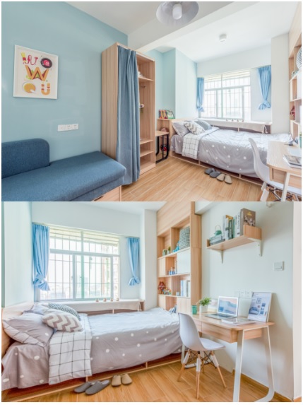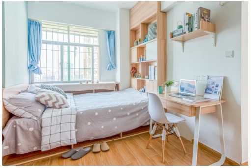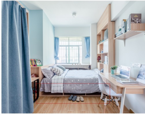 原物業(yè)戶型并不方正,結(jié)構(gòu)造成室內(nèi)有很多轉(zhuǎn)角,為了弱化結(jié)構(gòu)缺點,更好的規(guī)整空間,窩趣公寓選擇用榻榻米形式的床,而榻榻米本身就非常好利用做為強儲物空間設(shè)計。