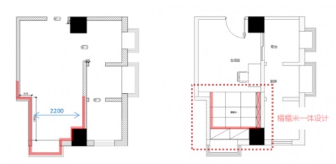 2200長的空間,做成榻榻米+儲物柜一體式的設(shè)計最適合不過,讓床、儲物柜可以很好的聯(lián)結(jié)起來,更節(jié)省空間。