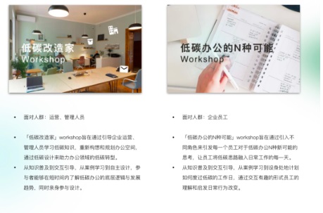 最后歡迎大家報(bào)名低碳辦公工作坊,與我們重新想象一個(gè)兼顧用戶體驗(yàn)和低碳可持續(xù)的“第二空間”。我們?cè)O(shè)計(jì)了“低碳改造家”和“低碳辦公的N種可能”兩種工作坊,供大家參考。