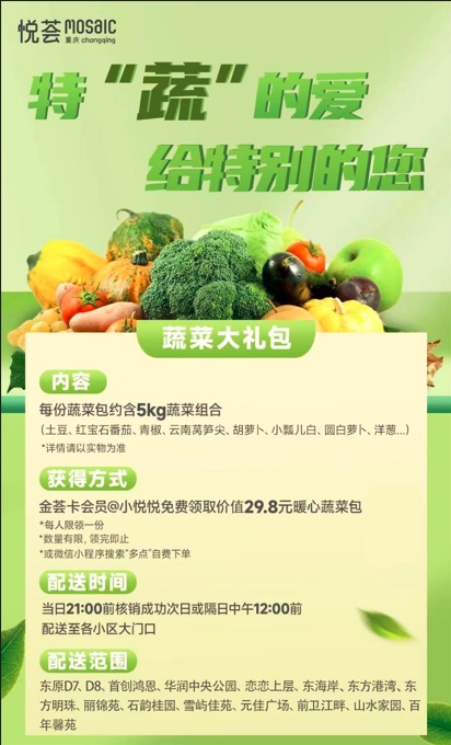 近日,我市市民面對(duì)這場突如其來的疫情,完全來不及儲(chǔ)存足量的新鮮蔬菜,“買菜”成了一大難題。為解決大家疫情當(dāng)下的燃眉之急,重慶悅薈購物中心為項(xiàng)目金薈卡會(huì)員免費(fèi)送上了愛心蔬菜包。
