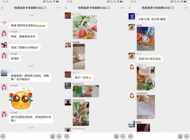 “菜很新鮮,感謝悅薈!”“蔬菜包已收到,感謝感謝”“收到了,感謝商場的愛”……收到蔬菜包后,大家在群里紛紛拍照刷屏,花式“曬菜”。
