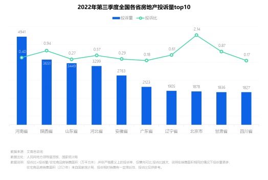 從地域分布來看,2022年第三季度河南省、陜西省、山東省、河北省、安徽省投訴量居前五,其中山東省房地產(chǎn)投訴量較去年同期增長111.21%,連續(xù)三個季度投訴總量較去年同期翻倍。