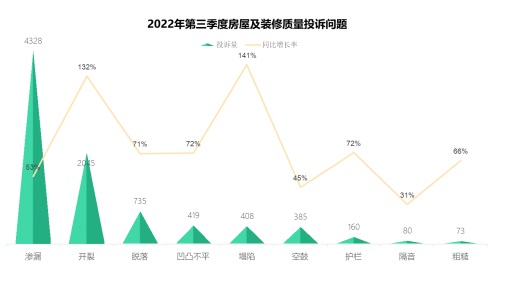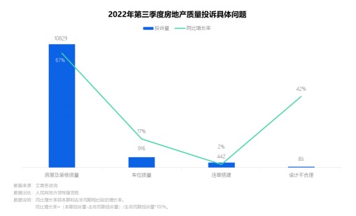本季度質量投訴中房屋及裝修質量相關投訴10829起,較去年同期增長67%;車位質量相關投訴916起,較去年同期增長17%;違章搭建、設計不合理相關投訴分別為442起、85起。