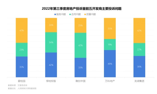 從投訴分類來看,本季度萬科地產(chǎn)、綠地控股服務問題居多,占比分別為46%、42%;碧桂園、龍湖集團質量投訴較多,占比均為42%;融創(chuàng)中國合同問題較多,占比42%。