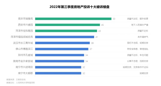 本季度被投訴最多的樓盤為南京市瑞雅苑,涉及投訴共53起,主要投訴問題為質量不達標、額外收費。