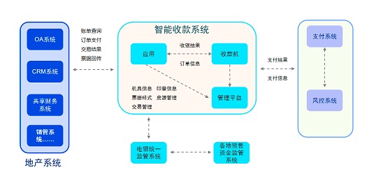 電銀信息房地產(chǎn)行業(yè)智慧收款方案主要由房地產(chǎn)開(kāi)發(fā)企業(yè)地產(chǎn)系統(tǒng)、電銀信息智能收款系統(tǒng)、電銀信息支付和風(fēng)控系統(tǒng)、電銀信息統(tǒng)一監(jiān)管系統(tǒng)、房管住建等監(jiān)管系統(tǒng)構(gòu)成,可實(shí)現(xiàn)的主要功能包括迎客儲(chǔ)客、交易辦理、智能收款、收款管理、電子收據(jù)、統(tǒng)一對(duì)賬等,智慧收款方案架構(gòu)圖如下所示: