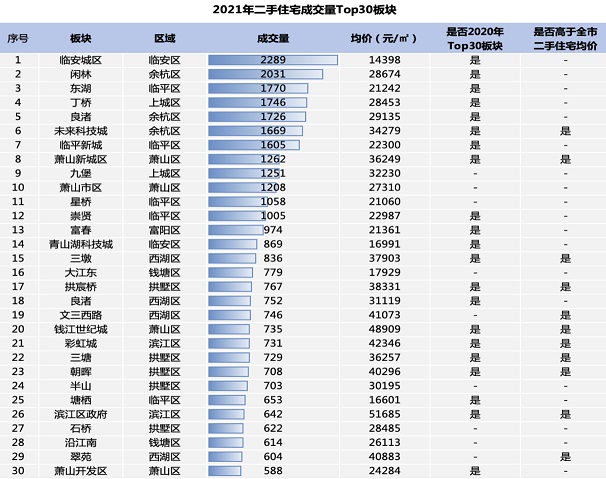 以二手住宅成交量來排名看,臨安城區(qū)以2289套成交量,占據(jù)2021年成交板塊榜首?傮w來看,Top30板塊的成交均價(jià)較低,臨安、閑林、崇賢、星橋、青山湖科技城均為高熱度的價(jià)格洼地。