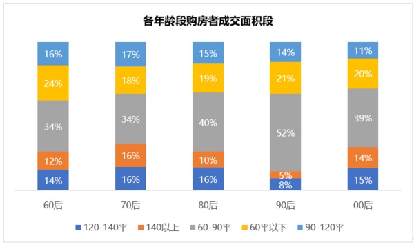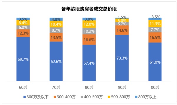值得注意的是,尚未大批進(jìn)入職場的00后購買力強(qiáng)勁。接近30%的90后會(huì)購買120㎡及以上的房屋,在90后中,這一比例僅為13%。在成交價(jià)段上,購買500萬元以上房屋的00后占比達(dá)到14.8%,購買800萬元以上占比3.5%,遠(yuǎn)超90后!