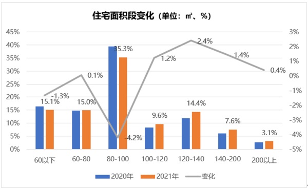 同時(shí),大面積住宅也更受歡迎。2021年二手住宅套均面積99㎡,為連續(xù)6年最高成交面積。在各面積段中,剛需群體青睞的100㎡以內(nèi)的住宅成交占比下滑,其中80-100㎡面積段下滑最為明顯。100㎡以上的住宅成交均有小幅上升,120-140㎡熱度上升信號(hào)強(qiáng)烈,剛改群體需求加劇。