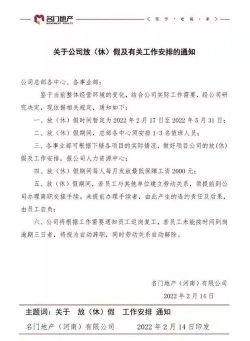 2月14日,名門地產(chǎn)發(fā)布了一則通知,讓全體員工強(qiáng)制“放長假”。按照這份通知,名門地產(chǎn)全體員工(除部分值班人員以外)從2月17日開始將放三個(gè)多月的集體長假。放假期間,公司總部各中心會(huì)安排1-3名值班人員。此外,在放假期間,公司會(huì)給每人每月發(fā)放最低保障工資2000元。