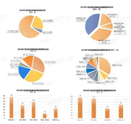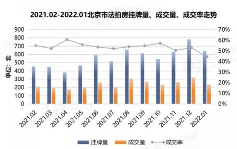 1月,北京法拍房市場(chǎng)掛牌房源644套,環(huán)比上月下降17.75%;成交房源233套,成交率為44%(按照扣除撤拍房源數(shù)量后計(jì)算得出)?傮w來(lái)看,北京法拍房市場(chǎng)掛牌數(shù)量在近5個(gè)月,除了2021年12月掛牌激增外,2022年1月份掛牌量位居第二位。