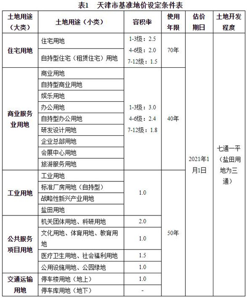 城鎮(zhèn)基準(zhǔn)地價(jià)覆蓋范圍為中心城區(qū)環(huán)外高速圍合區(qū)域內(nèi)全部區(qū)域、濱海新區(qū)內(nèi)城鎮(zhèn)建設(shè)用地以及其他市轄區(qū)政府所在城鎮(zhèn)的建成區(qū)、市級(jí)以上開發(fā)區(qū)(園區(qū))及示范園區(qū)等,總面積約4123平方公里。以2021年1月1日為基準(zhǔn)日,按照住宅、商服、工業(yè)、公共服務(wù)項(xiàng)目、交通運(yùn)輸五大類細(xì)分的21種土地用途,將土地劃分為4-12個(gè)級(jí)別,使用年期為法定最高出讓年限,開發(fā)程度為“七通一平”,地價(jià)表現(xiàn)形式為地價(jià)和樓面地價(jià)。