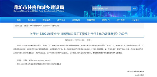 房訊網(wǎng)訊 濰坊市住建局近日發(fā)布了《2021年度全市住建領(lǐng)域農(nóng)民工工資支付責任主體的處理意見》,自2022年3月8日至15日向社會公示,表彰治欠先進企業(yè),懲戒欠薪責任主體,進一步規(guī)范農(nóng)民工工資支付行為,保障農(nóng)民工按時足額獲得工資。
