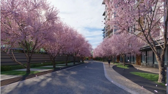 為了與日式禪意奢宅這個定位相呼應(yīng),項目還在小區(qū)門口重金打造了一條櫻花大道