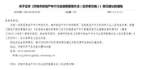 為進(jìn)一步規(guī)范房地產(chǎn)中介市場(chǎng)行為,維護(hù)房地產(chǎn)中介市場(chǎng)秩序,促進(jìn)房地產(chǎn)中介機(jī)構(gòu)和從業(yè)人員誠(chéng)信自律,近日,濟(jì)南市住房和城鄉(xiāng)建設(shè)局公布《濟(jì)南市房地產(chǎn)中介行業(yè)信用管理辦法(征求意見稿)》(以下簡(jiǎn)稱:《辦法(征求意見稿)》)。