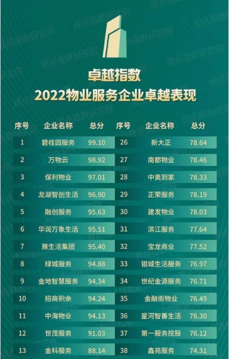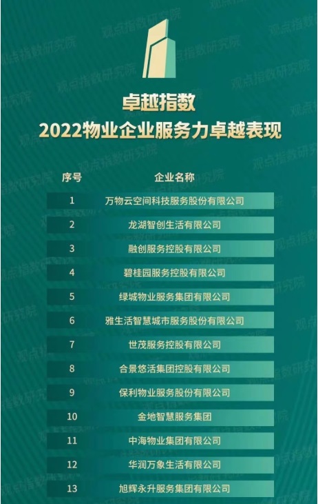 4月12日,觀點機構(gòu)在廣州香格里拉大酒店舉行“2022觀點物業(yè)大會”,活動現(xiàn)場,觀點指數(shù)研究院獨家發(fā)布“卓越指數(shù)·2022物業(yè)服務(wù)年度卓越表現(xiàn)”,從綜合實力、服務(wù)水平到財務(wù)及資本市場表現(xiàn)、創(chuàng)新科技服務(wù)等不同維度盤點中國物業(yè)服務(wù)企業(yè)的運營表現(xiàn),表彰過去一年里極具代表性、指標意義的企業(yè)、品牌和團隊。