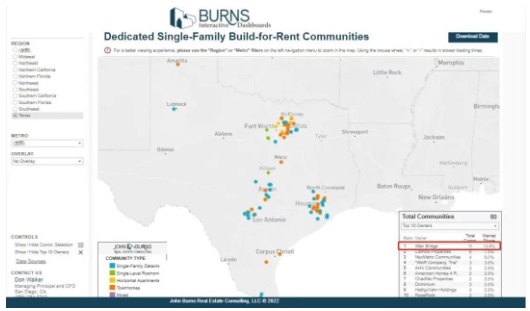 據(jù)美國權(quán)威房地產(chǎn)咨詢機構(gòu)John Burns 4月定制型長租別墅社區(qū)市場份額排名,Wan Bridge以市場份額13.8%奪得德州榜首!在全美市場占比2.3%,排名第四。