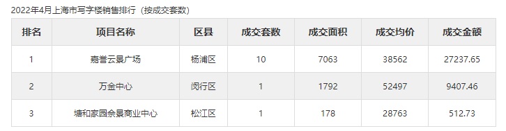 2022年4月,上海市寫(xiě)字樓成交量前十的樓盤(pán)為:嘉譽(yù)云景廣場(chǎng)、萬(wàn)金中心、塘和家園佘景商業(yè)中心。其中,成交套數(shù)最多的是嘉譽(yù)云景廣場(chǎng)共成交10套,成交面積為7063㎡,成交均價(jià)為38562元/㎡,成交金額為27237.65萬(wàn)元。