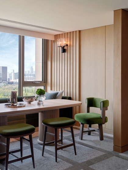 早餐區(qū)的座椅延續(xù)了茶吧所使用的墨綠色,視野也是這里的一大亮點(diǎn),在陽光大好的清晨望向窗外,可以清晰看到望京商務(wù)區(qū)。