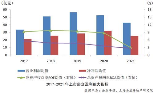 盈利能力方面,盈利空間有所收窄,各項指標均有下降。2021年,上市房企營業(yè)利潤均值42.81億元,同比下降18.41%;凈利潤均值25.19億元,同比下降21.70%;凈資產收益率均值3.04%,較上年下降5.74個百分點;總資產報酬率均值2.65%,較上年下降0.97個百分點?傮w來看,各項盈利能力指標均較上年有不同程度的下滑。