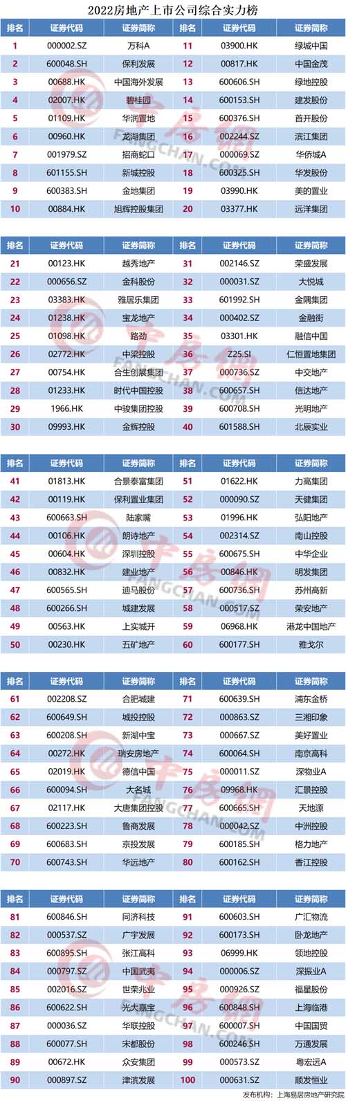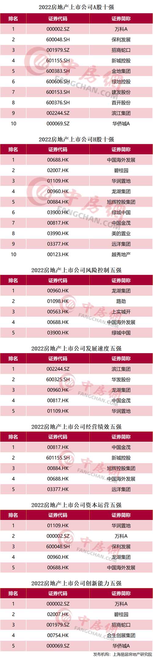 附一:2022房地產上市公司綜合實力榜、單項榜