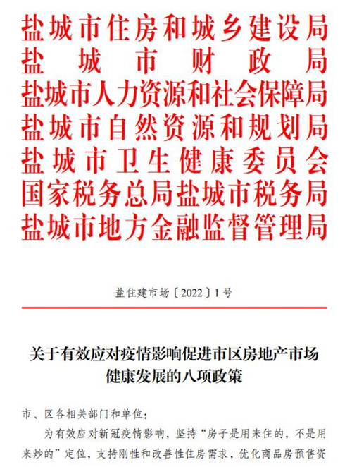 房訊網(wǎng)訊 近日,江蘇省鹽城市住房和城鄉(xiāng)建設(shè)局聯(lián)合多部門出臺《關(guān)于有效應(yīng)對疫情影響促進市區(qū)房地產(chǎn)市場健康發(fā)展的八項政策》,支持剛性和改善性住房需求,優(yōu)化商品房預(yù)售資金監(jiān)管,促進房地產(chǎn)業(yè)健康發(fā)展。